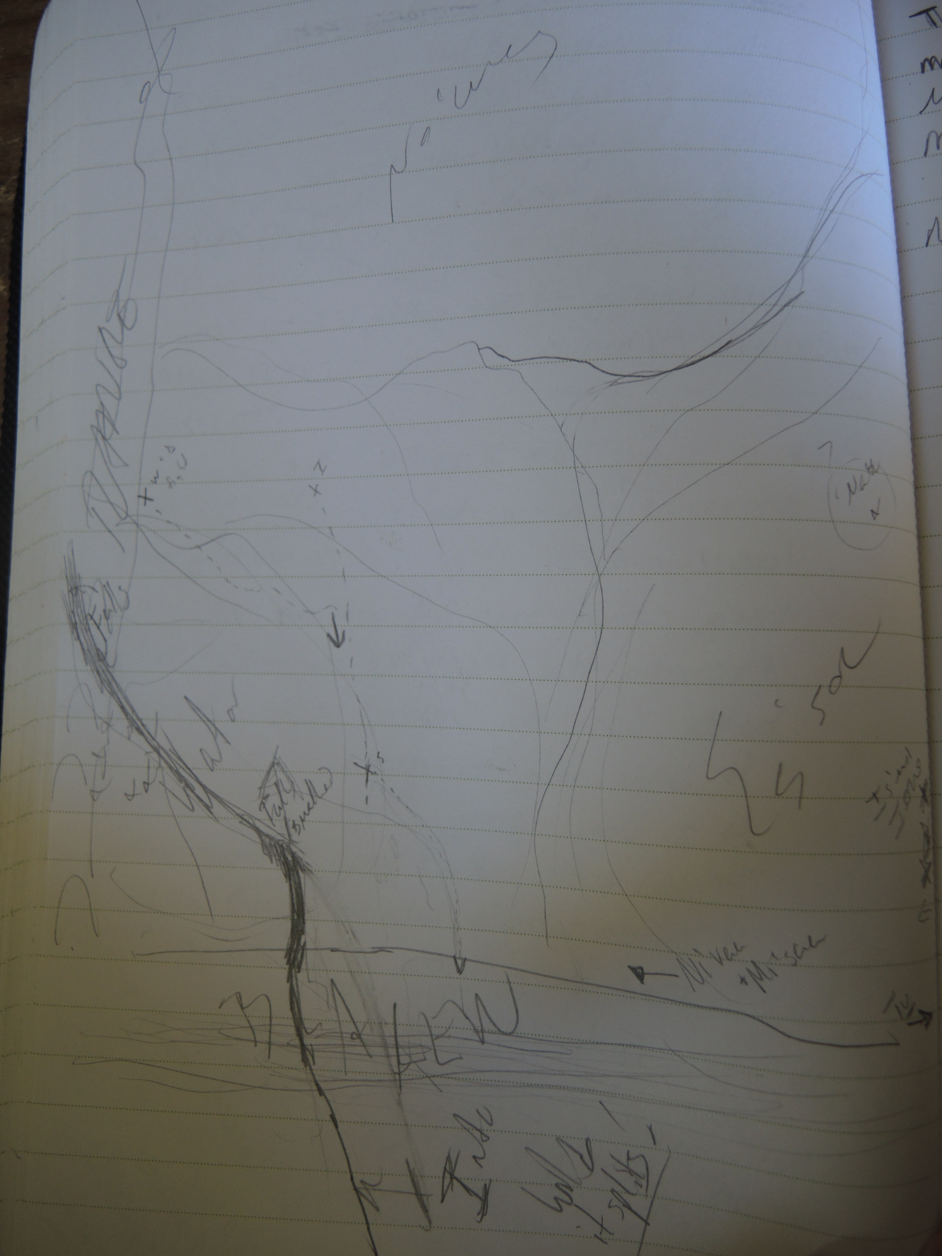 The dark line is a river that looks nothing as it really would. There are two places I’ve marked where the rivers turns into falls, one within the mountain range that runs along the left-hand side of the page. Use your imagination that those little lumps I drew are actually mountains :)